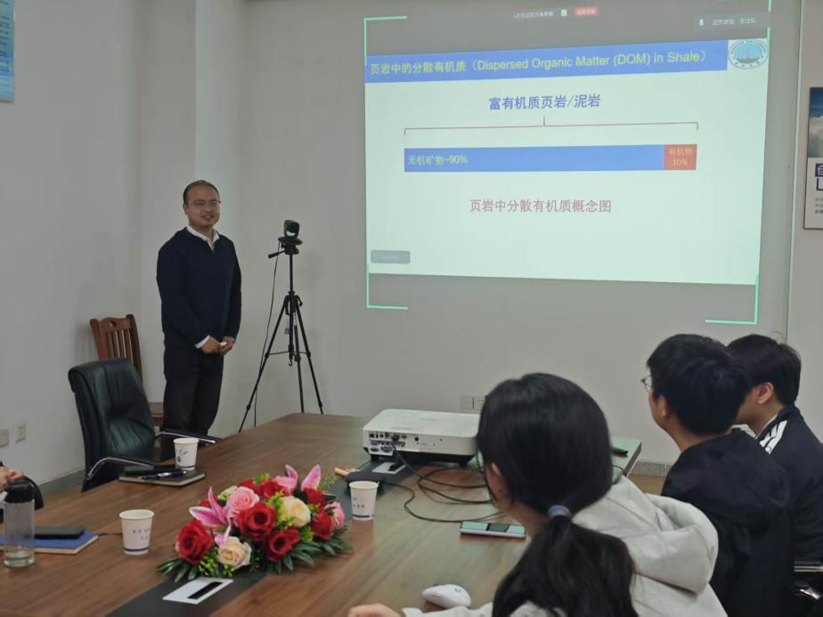 陈吉副教授以《页岩中分散有机质成因与特征》为题,为同学们带来了一场关于页岩有机地球化学与有机岩石学的深度解析。报告从有机地球化学和有机岩石学的双重视角出发,系统介绍了页岩中分散有机质的成因类型、赋存状态及其光学与化学特征。他指出,分散有机质作为页岩的重要组成部分,其成因多样,包括生物残骸、腐殖质、沥青质等,这些有机质在沉积成岩过程中经历了复杂的演化路径,形成了独特的赋存状态和化学性质。报告详细阐述了不同生物来源有机质在沉积成岩过程中的演化机制及其影响因素,如温度、压力、氧化还原条件等。陈吉老师还通过实例分析,展示了分散有机质对烃源岩生烃潜力与储集性能的指示意义,为理解页岩气等非常规能源的成藏规律提供了重要线索。