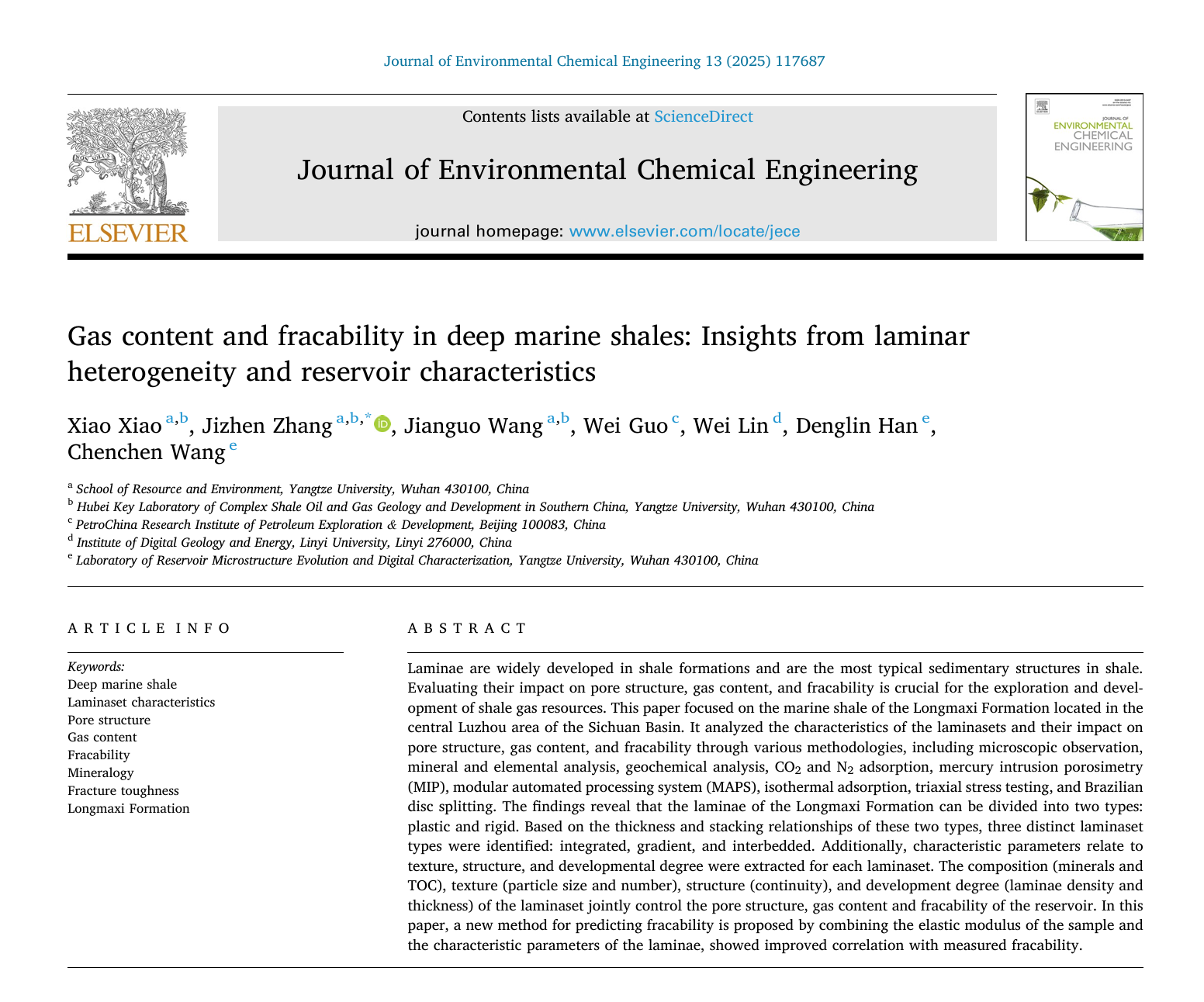 (通讯员 张吉振)在全球能源转型背景下,页岩气作为清洁能源的重要补充,其高效开发成为国际能源领域的核心议题。然而,深海页岩的复杂储层特征(如差异纹层层理异质性)对含气性和可压裂性的影响机制尚未完全明晰。针对这一科学难题,williamhill英国在读硕士研究生肖肖在导师张吉振副教授指导下,在国际权威期刊《Journal of Environmental Chemical Engineering》(JCR 1区,IF=7.2)发表题为"Gas content and fracability in deep marine shales: Insights from laminar heterogeneity and reservoir characteristics"的研究论文,首次系统揭示了多类型复杂纹层层理结构对页岩储层性能的差异性控制规律,为深层页岩气勘探开发提供了科学理论支撑。williamhill英国为第一完成单位。