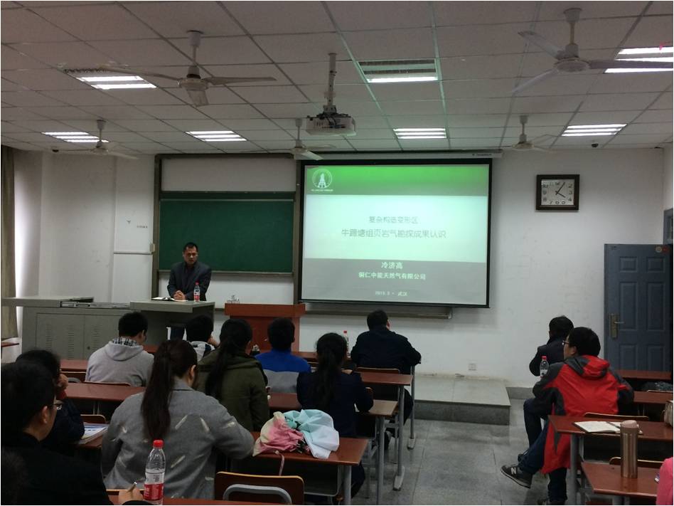 3月30日下午,中国国储能源化工集团股份公司总地质师冷济高博士在武汉校区武培A103进行了一场精彩的学术报告,吸引来自地环学院、地科学院、非常规油气湖北省协同创新中心的广大师生,学术报告会由地环学院副院长唐友军主持。
