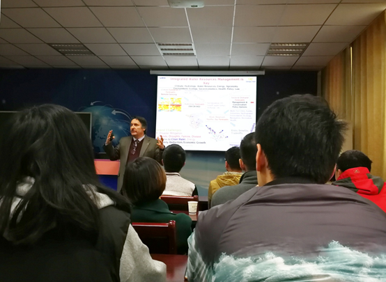 在长达一个半小时的报告中,ArisGeorgakakos教授围绕气候变化的具体表现、给水资源管理与保护带来的挑战和中国为遏制气候变化所做的努力三方面进行了详细的论述。“气候变化是毋庸置疑的,虽然现在很多人仍然不能切身感受到这种变化。”Aris Georgakakos教授首先肯定了气候变化的确定性,并通过大量生活中的案例来佐证这一观点。同时,Aris Georgakakos教授阐述了季节性的气候变化、水源短缺、水质恶化问题给水资源管理和保护带来的巨大挑战,也对中国在环境保护方面作出的努力表示感谢和赞赏。报告中,Aris Georgakakos教授特别强调了让学术研究成果应该服务社会,指导社会实践和决策,融入社会应用,为社会创造价值的学术观点。Aris Georgakakos教授的报告内容丰富,深入浅出,幽默风趣,赢得了现场师生的阵阵掌声。