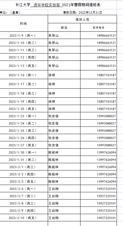 英国威廉集团 资环学院实验室 2023年寒假期间值班表