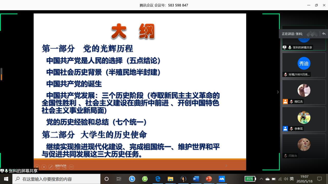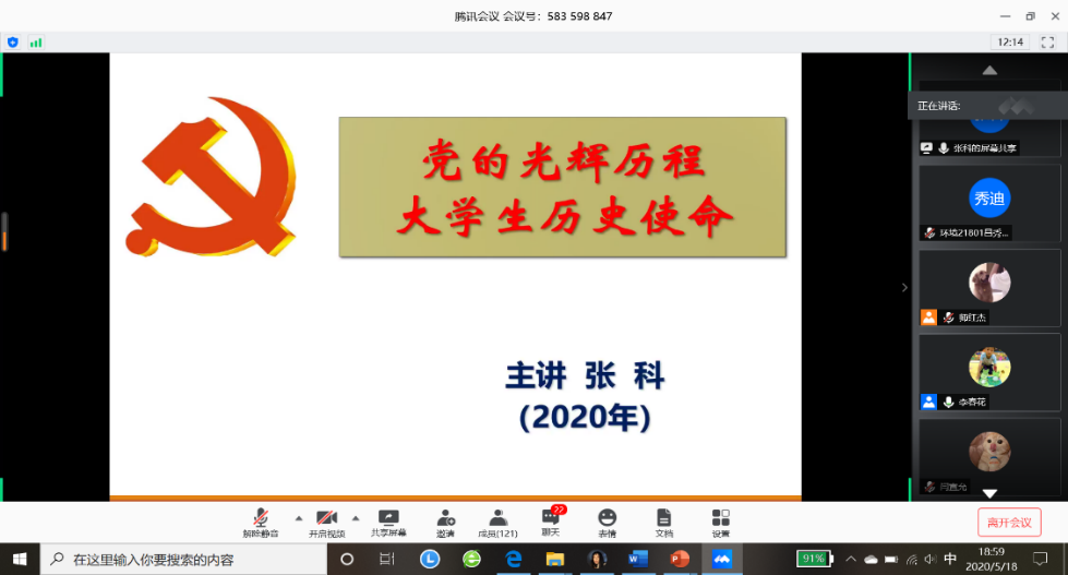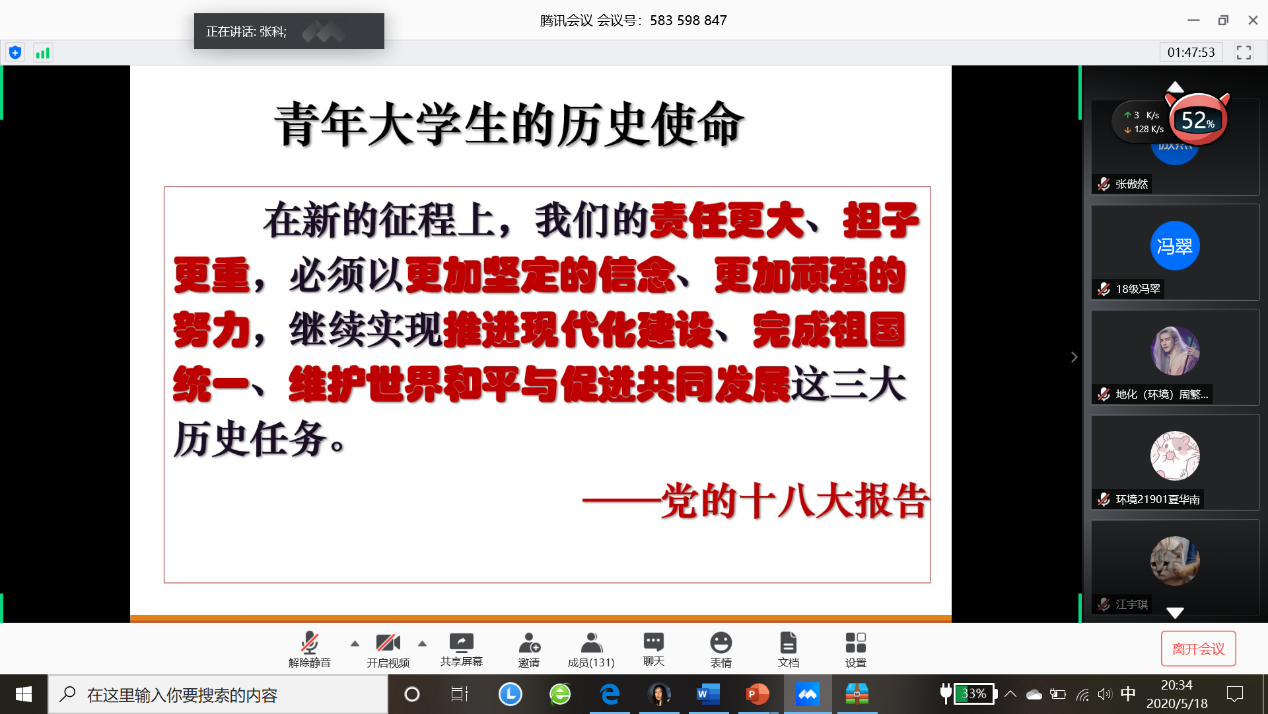 (图/文:吕秀迪)为进一步做好williamhill英国党员发展工作,加强对发展对象和入党积极分子的教育和培养,引导其提高思想觉悟,保证发展新党员的质量。资环学院于2020年5月18日晚19:00以线上腾讯会议的形式举行了2020年上半年入党积极分子和党员发展对象培训会议。资环学院党委书记张科主讲,党委副书记范梅英参加、本科威廉希尔党支部书记李春花主持,共130余名入党积极分子和党员发展对象线上学习。