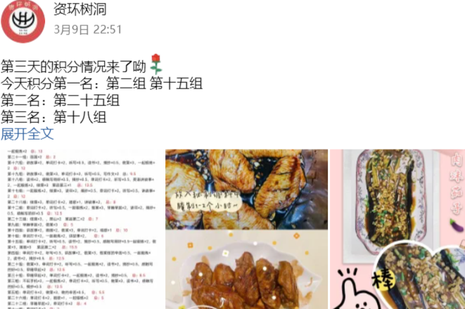 活动采取每日打卡积分制,前期通过工作人员随机分组,形成两两一组的形式,每小组共同完成打卡任务,要求活动内容积极向上,提交给资环树洞。后期由工作人员进行打分,并将分数进行累积,统计入表格中。
