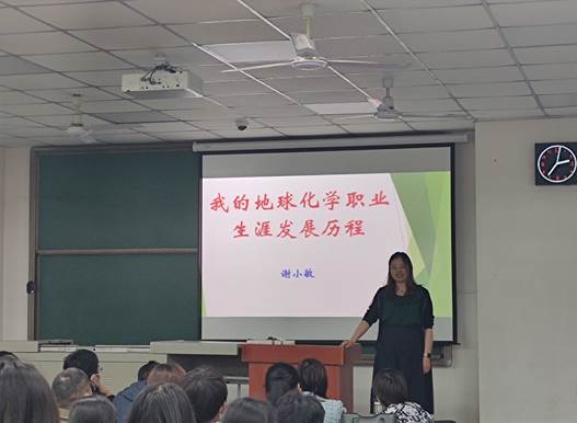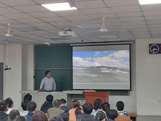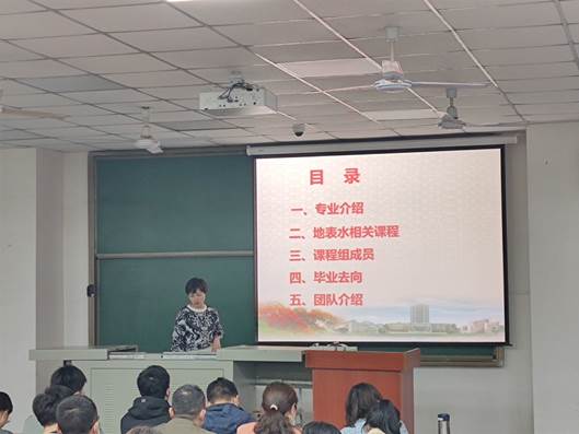 在大会第三项中,学院各研究团队的导师代表分别上台进行了导师介绍,地球化学系的吴越老师和陈果老师分别介绍了岩矿地球化学和有机地球化学的导师团队,优秀的师资力量和先进的实验设备都让大家叹为观止。而水环系的贺美老师,陈燕飞老师,陈彦美老师对于水环境,地表水以及地下水各方面的详细介绍,再次获得了现场的掌声雷动,尤其是陈燕飞老师慷慨激昂的一句“选择水文水资源专业就是选择美好的人生!”,更是引起了同学们的热烈反响。