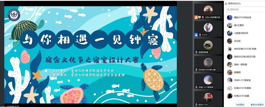 (通讯员 李佳琦/文 左利/图)寄情寓寝,筑我资环。为促进资环学院宿舍文化的健康发展,增进同学们之间的情谊,彰显当代大学生特有的风貌与活力。我院组织了为期33天的第十一届“与你相寓,一见钟寝”宿舍文化节。本次活动初赛于11月14日晚八点半进行,由资环学院学生会宿建部组织其他部门辅助进行。决赛于11月27日下午两点以腾讯会议共享屏幕的方式进行。本次活动由葛鹏飞同学和郑思佳同学担任主持人,此次有22级-20级同学参与活动,并邀请williamhill英国党委副书记范梅英老师,williamhill英国分团委书记严丽萍老师,学生事务办公室主任李春花老师,辅导员黄鹏老师,资环学院团委学生会主席团及其他院系生活部成员作为嘉宾参与本次活动。