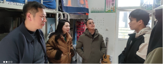 在宿舍走访过程中,老师们积极听取学生各方面诉求,详细了解学生寒假学习成果及新学期学业规划,院长夏小平特别勉励同学们要在新的学期不断奋进拼搏,既要扎实打好专业基础,又要培养创新思维。学院领导特别关注了同学们的返校情况,心理状态,毕业年级考研及就业情况,鼓励同学们保持积极心态,迎接新学期新挑战。同学们对院领导的关心关爱纷纷表示感谢,并承诺将严格遵守宿舍管理规定,共建平安美丽校园。