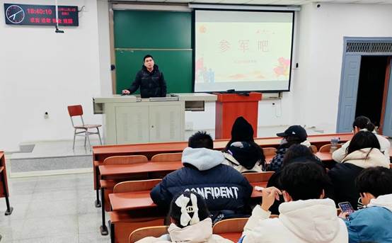 2023年12月13日,学院于武教B106举行征兵宣讲活动,旨在帮助同学们进一步了解征兵政策和军队生活,促使同学们响应国家号召,踊跃报名参军。本次宣讲会由辅导员老师黄鹏和退伍学生黄榜进行宣讲,23级全体本科生参加。