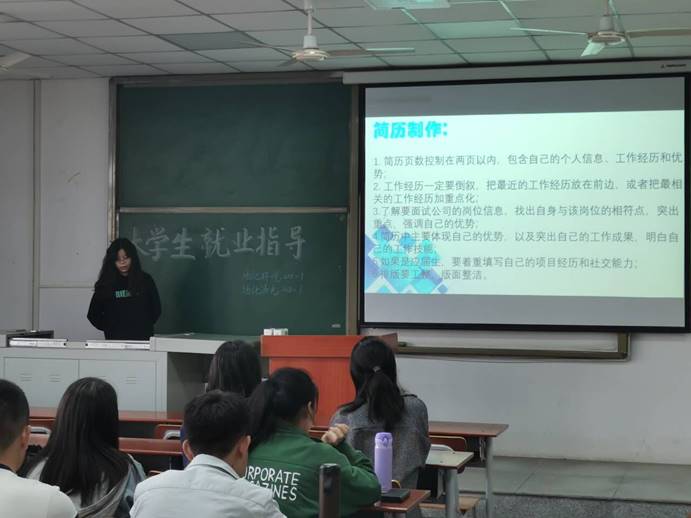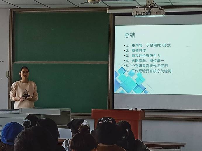 随后主持人根据PPT介绍讲解就业的前景,通过图文结合的形式向大家展示,如何在就业的过程中快速准确的搜集信息。主持人还提到同学们在不影响学业的情况下,要通过多种途径广泛收集社会需求信息,并对信息进行分析、筛选、比较和整理。再将其分为主次、先后顺序。