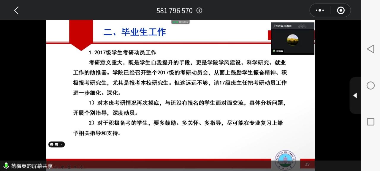 随后,范书记对学院的毕业生工作进行了分析。她希望毕业班的班主任能细化,深化2017级学生考研动态工作,鼓励学生积极考研。对于未报名的同学,也希望班主任能积极鼓励,帮助同学们明确自己未来的目标。范书记对16届学子的就业率进行了说明,她指出16届学子的考研率较其他学院来说相对较低,希望班主任能和同学们共同努力,积极配合,争取提高17级毕业生的就业率,让17级的学子目标更加明确。