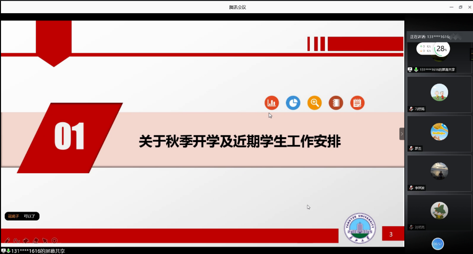 (通讯员 刘思雨/图 李婉婷/文)全国上下万众一心,共同抗击疫情数月后,各地疫情基本已经得到控制,我们也终于看到了胜利的曙光。8月21日下午3点,英国威廉集团资环学院于线上腾讯会议进行了一场班主任会,本次会议主要是关于秋季开学及近期学生的工作安排。本次会议由范梅英书记主持,所有班主任老师出席本次会议。本次会议的目的主要是讲述如何利用开学前的这一段时间,严防死守、群控群防,确保各项防控措施得到落实,扎实做好春季开学各项疫情防控准备工作。