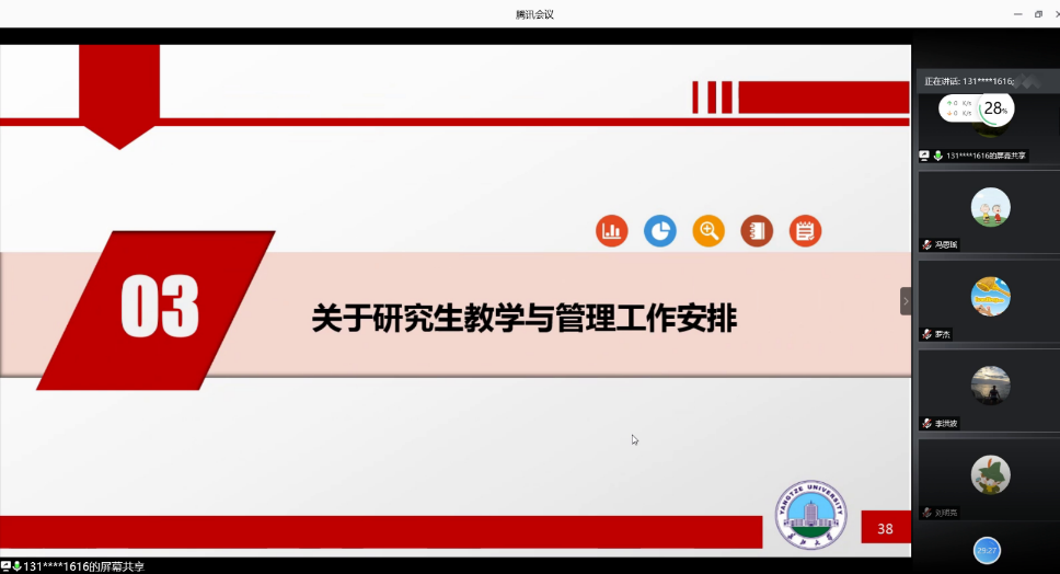 首先,范梅英书记汇报了暑假重点工作的进展及存在的主要问题。随后讲到秋季开学的工作实施方案,包括,学生报道安排、学院审批标准、学院学生到校时的报道方法等等。范梅英书记讲到,本次开学务必做好学生到校后的校园管控,做到对个人和家庭负责,对国家和社会尽责!最后分别讲述了本科生和研究生的教学工作安排。