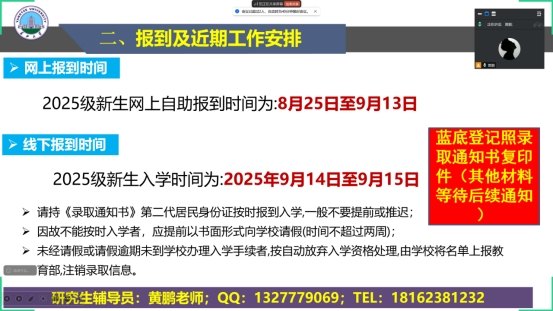 (通讯员 黄鹏)金秋送爽,丹桂飘香,为欢迎2025级研究生新同学,帮助他们提前了解新环境、开启新篇章,我院于2025年9月5日在线上召开“梦想起航,安全至上”2025级研究生开学主题班会。研究生辅导员黄鹏老师及2025级新生参加。
