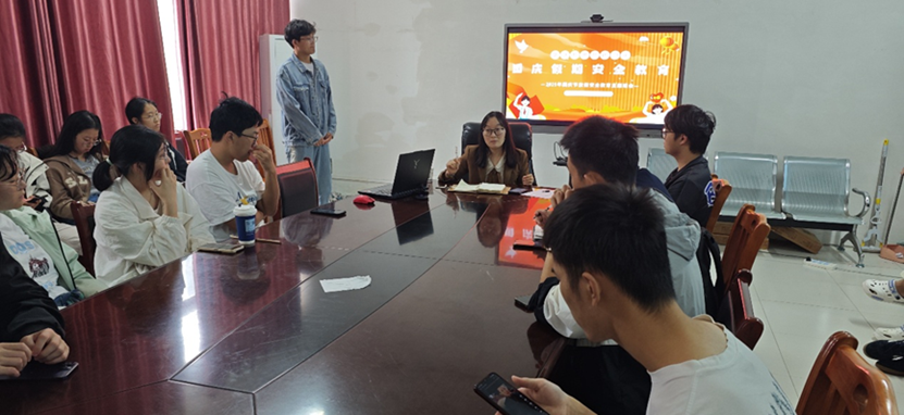 会上,宿舍建设部苏新宇同学围绕假期安全主题,以PPT形式从假期时间安排、消防安全、出行安全、饮食卫生、防范电信诈骗及防溺水等多个方面展开讲解,全面系统地普及安全知识,切实提升学生安全意识和自我防护能力。