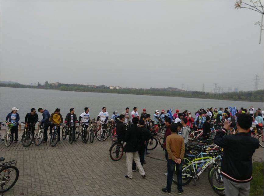 骑行过程中,从水务局——简朴寨——新一中——老一中——区委大院——后官湖——多福山庄——京珠红光村——水务局,整段路程大家都热情高涨,所有水协成员先领略了蔡甸街区内部的人文景象,然后陶醉在学校周边的美好湖光山色中,并且受到致力于水务工作的前辈们无限正能量的激励,他们有组织、有纪律的出行团队让我们水协成员深受感触,他们为水务、为环境的努力和付出更值我们水文人学习和发扬。上午九点,所有参与活动的人员在后官湖小公园处再次集体合影为此次极具宣传意义的骑行活动再添让人难以忘怀的一笔。