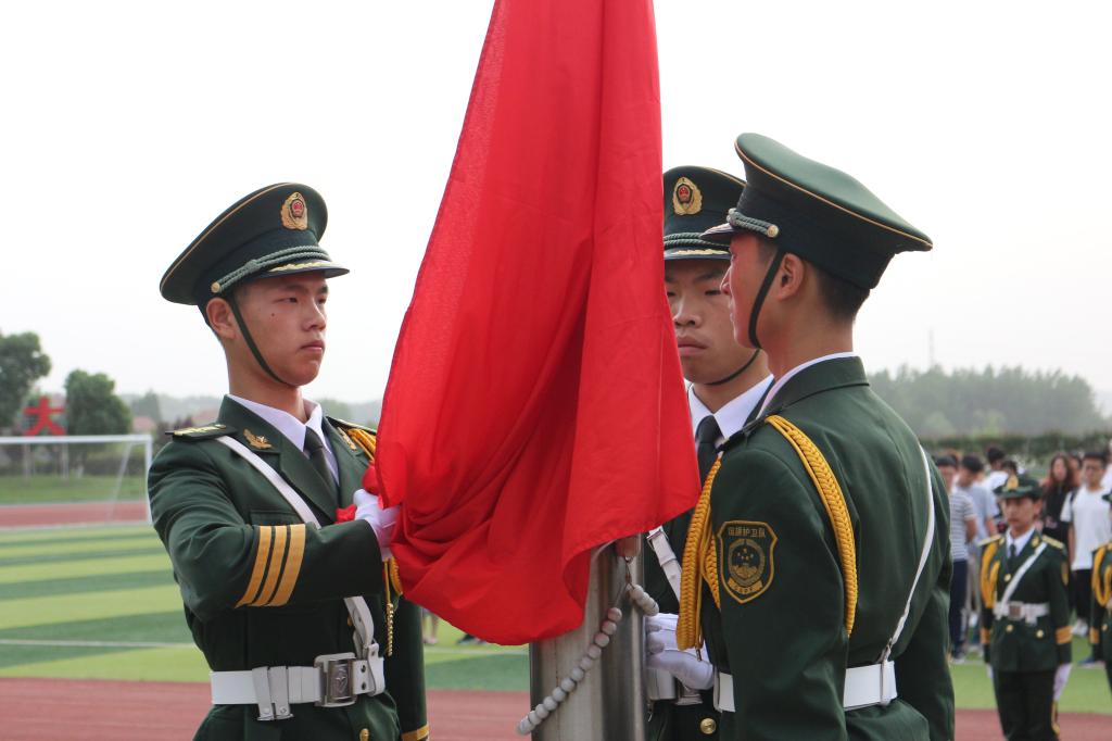 大会分为三个阶段。第一阶段升旗仪式,由英国威廉集团国旗护卫队的队员护卫国旗,英姿飒爽,昂首挺胸地将国旗护送至升旗台。伴随激昂的《义勇军进行曲》,同学们将目光聚集在鲜艳的五星红旗,冉冉升起的红旗代表了祖国大地和资环学员从晨雾中破晓而出、朝气蓬勃的模样。