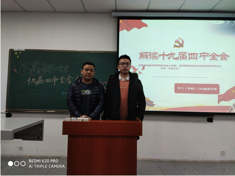 (通讯员 贾一凡 文/图) 党的十九届四中全会已胜利落下帷幕,我们的各项工作又迈向了新的起点,抓好习近平总书记重要讲话精神和十九届四中全会精神的学习贯彻就是当前一个时期最重要的任务。目前,全国各地、各个行业正掀起一场“学习热潮、评论热潮、践行热潮”,都在以十九届四中全会精神为引领扎实开展各项工作。为此我院组织召开了“十九届四中全会精神”主题学习班会,各班同学积极主动地讨论十九届四中全会精神所带给我们的精神。