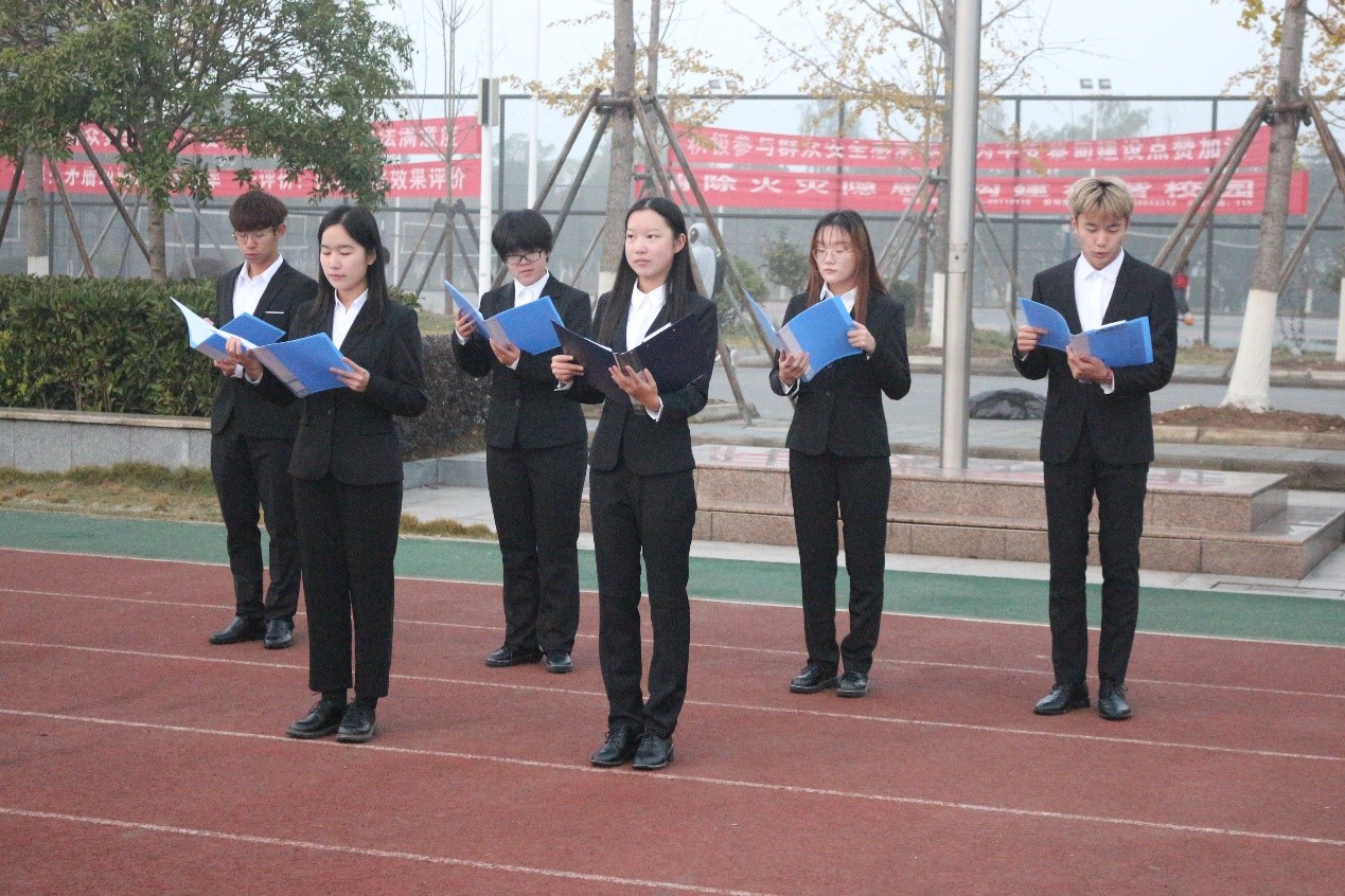 第三阶段由学生代表王蓉、刘怡彤、傅浩、王云、魏嘉嘉、韩翊群朗诵《歌唱祖国》。风雨苦难我们一起走过,辉煌成就我们一起创造。我们从风尘中走来,又从硝烟中穿越,历史早已把我们写成殷实的血。倾洒我们的一腔热血,让红色精神与我们同行。