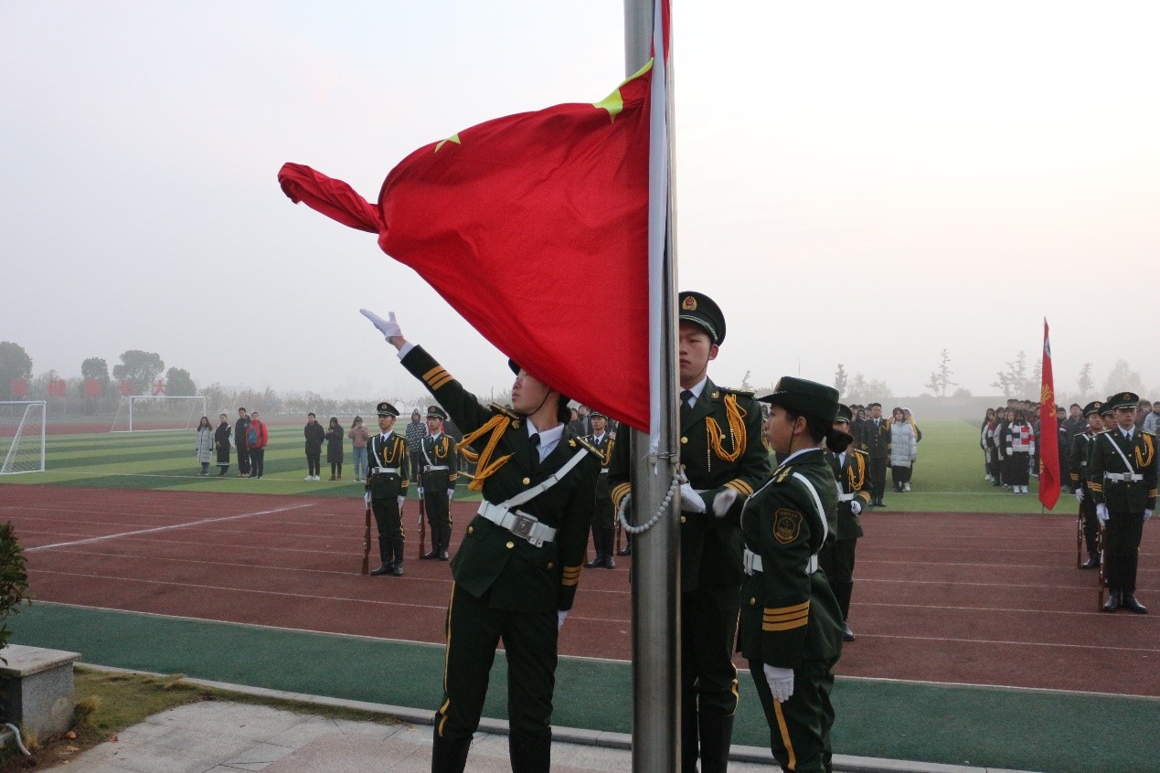 大会分为三个阶段。第一阶段升旗仪式,由英国威廉集团国旗护卫队的队员护卫国旗。只见他们不畏冬日的寒冷,每一个人都英姿飒爽,昂首挺胸地将国旗护送至升旗台。伴随激昂的《义勇军进行曲》,同学们将目光聚集在鲜艳的五星红旗之上,冉冉升起的红旗犹如一团火焰代表了祖国大地和资环学员从晨雾中破晓而出、朝气蓬勃的模样。