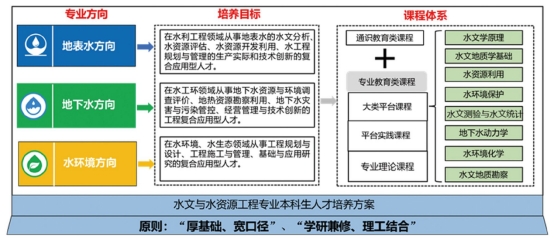 面向国家重大发展战略需求,遵循教育教学发展规律,统筹基础知识和课外时间,开设了地表水、地下水和水环境三个专业方向,形成了通识教育类课程和专业教育类课程相结合的课程体系,遵循“厚基础、宽口径”和“研学兼修、理工结合”的培养原则,培养专业基础知识扎实、实践能力强、综合素质高、具有创新能力、创业精神和国际视野的水文与水资源工程专业应用复合型人才。历年毕业生就业率均保持在95%以上,就业去向多为长江水利委员会水文局、各省水文局、地质队、水电公司等国家企事业单位。