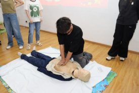 培训结束后,医护人员组织师生进行CPR实操演练。在医护人员专业示范和“一对一”指导下,师生们借助人体模型,严格按照操作规范进行练习。医护人员耐心细致地纠正按压位置、深度、频率以及人工呼吸手法等关键环节,确保师生准确掌握操作要领。师生们积极参与,反复练习,现场学习氛围热烈。