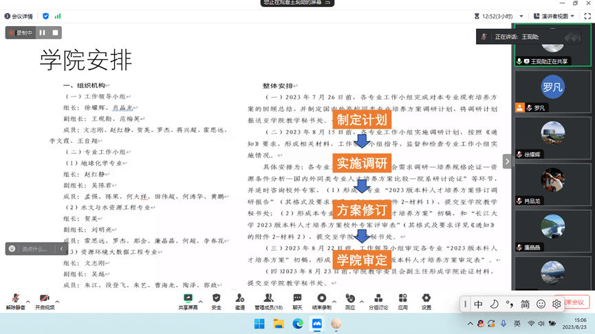 为进一步深化本科教育教学改革,构建高水平人才培养体系,提高人才培养质量,促进学院本科教学和专业建设高质量发展,根据学校相关通知要求,我院对2023版本科专业人才培养方案进行了修订工作,并于8月23日下午线上召开了2023版本科专业人才培养方案修订稿审定会议,学院领导、学院教学指导委员会成员、专业负责人和系主任参加了会议,会议由副院长王现勋主持。