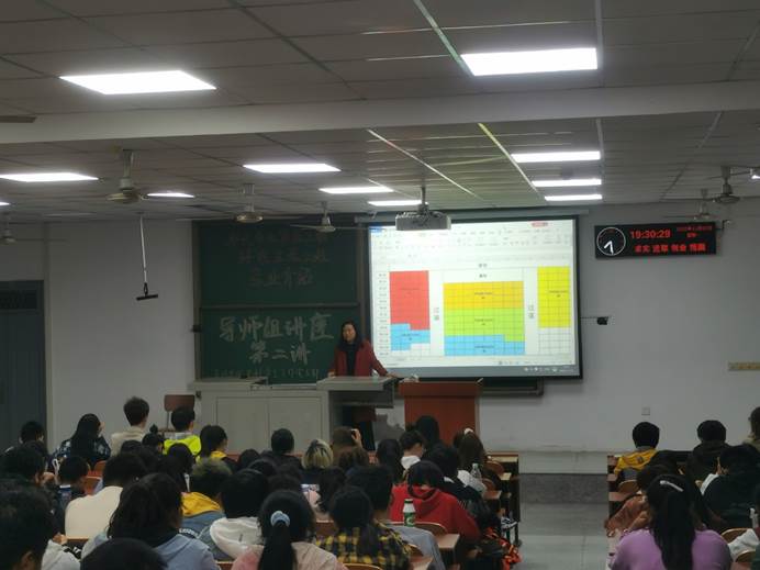在讲座的最后,资环学院党委副书记范梅英表示,水文与环境专业是国家当下重要的发展方向,两个专业的前景非常广阔。同时范书记也希望新生对大学生活能够有一个明确的目标,要对大学生活有所规划,从大一开始树立考研计划,合理规划学习方法。