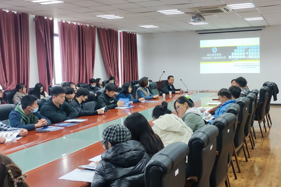 会议由学工团委书记严丽萍老师主持,在短暂的介绍了领导及嘉宾后宣讲会直接进入主题,会议由湖北省水文地质工程勘察院院长对勘察院的招聘需求及发展现状进行了详细的讲解,人事部经理对勘察院的技术人员情况进行了介绍,讲解完毕后由现场同学们进行咨询和提问,不少同学对该单位表示了浓厚的兴趣,大家纷纷举手提问,勘察院院长对同学们的提问进行了耐心回答,对于投递简历和签订三方协议的过程,人事部经理也进行了说明,表示大家都可以现场投递简历,随后不少同学也积极提交了自己的简历。