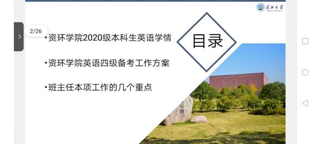 会议中,李春花老师从资环学院2020级本科生英语学情、资环学院英语四级备考工作方案、班主任本项工作的几个重点三个方面展开了动员。