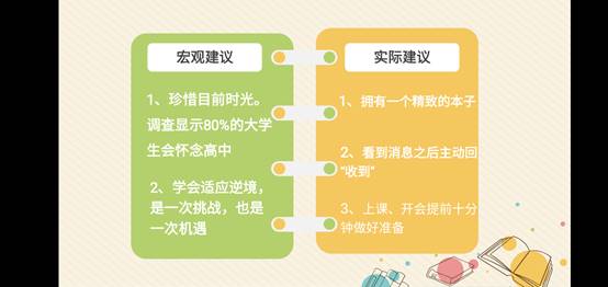 在情绪管理部分结束后,志愿者刘飞翔站在大学生的角度,思考自己如若在进行一次高考,学习方面会注意哪些方法和细节,向大家分享了一些自己的学习经验。他首先建议大家一定要跟着老师的讲解,逐步构建自己的知识框架。在学习过程中,老师的帮助经常会对自己的学习产生很大的影响,往往会达到事半功倍的效果。紧接着他提出需要激发自己内心对于学习的兴趣,建议大家将学习视为提升自己的过程,每天设置一定的学习任务,按时完成它。这部分最后,他表示考上一所好的大学对每个高中生来说都十分重要,高考成绩决定着你的大学,间接决定了你所结交的朋友,对于自己未来的发展有很大的影响。高考是人生的一个分水岭,我们要充分利用疫情在家中学习的时间,逐渐完善自我,提升自身综合素质。