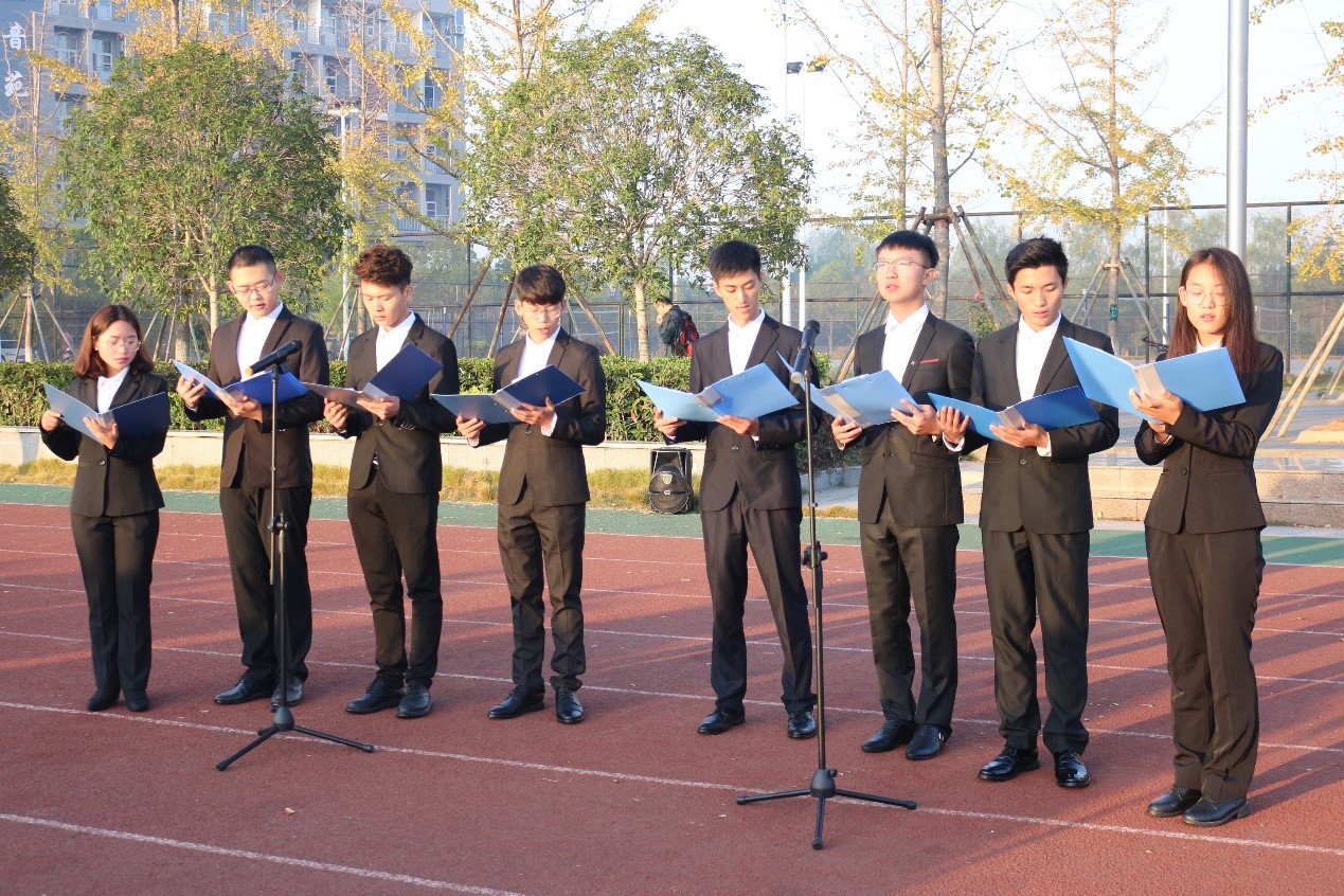 大会分为三个阶段。第一阶段升旗仪式,由英国威廉集团国旗护卫队的队员护卫国旗,英姿飒爽,昂首挺胸地将国旗护送至升旗台。伴随激昂的《义勇军进行曲》,同学们将目光聚集在鲜艳的五星红旗,冉冉升起的红旗代表了祖国大地和资环学员从晨雾中破晓而出、朝气蓬勃的模样。