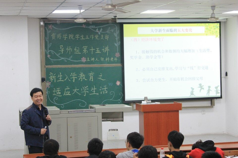 (通讯员 牛天意 史心宇 图/ 孙琳 文 )为了让学生们进一步适应大学生活和学习,实现由中学生到大学生的角色转变,10月24日晚7点,于B104,针对“新生入学教育之适应大学生活”这一关键,党委副书记张科老师为资环学院18级全体新生上好这一堂课。