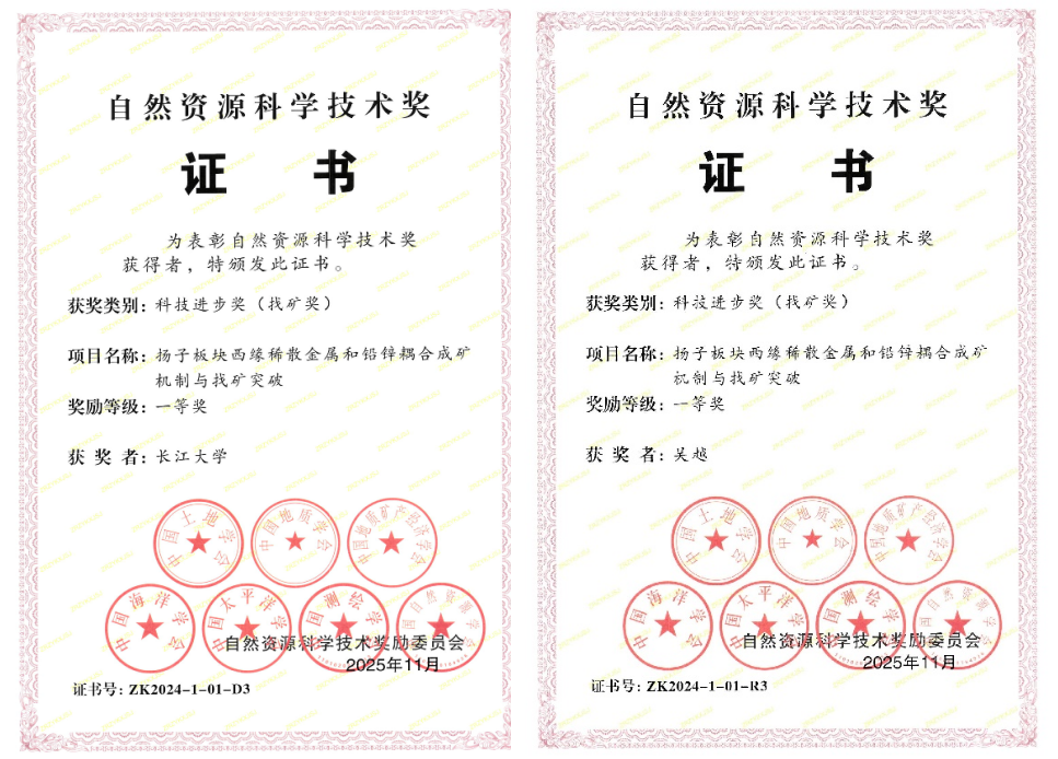 近日,自然资源部公布了2024年度自然资源科学技术奖评选结果。由我院吴越教授团队参与完成的“扬子板块西缘稀散金属和铅锌耦合成矿机制与找矿突破”项目,荣获自然资源科技进步奖(找矿奖)一等奖(排名第3)。