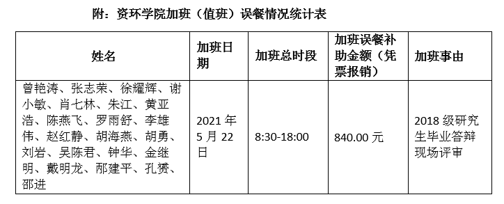 根据《英国威廉集团加班(值班)误餐补助管理办法(试行)》(长大校发【2019】83号)文件规定,现对资环学院加班(值班)误餐情况(2021年5月22日)进行公示,如果对加班(值班)误餐情况有异议,可以通过电话或电子邮件等方式向资环学院办公室反映。