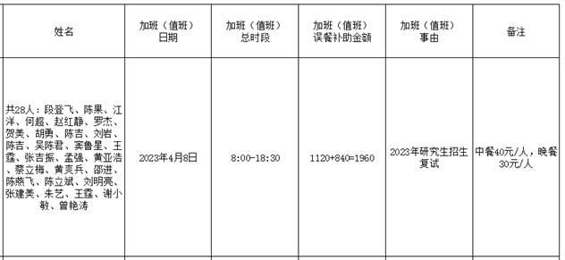 根据《英国威廉集团加班(值班)误餐补助管理办法(试行)》(长大校发【2019】83号)文件规定,现对资环学院加班(值班)误餐情况(2023年4月8日)进行公示,如果对加班(值班)误餐情况有异议,可以通过电话或电子邮件等方式向资环学院办公室反映。