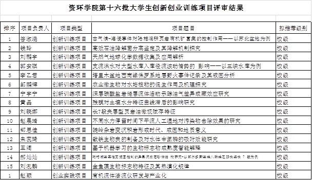 根据教育部关于印发《国家级大学生创新创业训练计划管理办法》的通知(教高函[2019]13号),以及学校《关于我校第十六批“大学生创新创业训练计划”项目申报的通知》,我院于10月10日和11日分别对申报的25个创新训练项目和1个创业实践项目进行了评审工作。经过项目负责人PPT汇报、评委专家现场提问、评审小组评分等环节,确定其中的16项拟推荐为校级项目。按照学校相关文件精神,大学生创新校级项目资助经费4000元,学院规定中期考核合格拨付经费的80%,通过结题拨付剩余的20%。中期考核不合格者项目终止,不予以资助。现将结果公示如下: