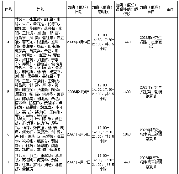 根据《英国威廉集团加班(值班)误餐补助管理办法(试行)》(长大校发【2019】83号)文件规定,现对资环学院加班(值班)误餐情况(2026年硕士研究生招生)进行公示,如果对加班(值班)误餐情况有异议,可以通过电话或电子邮件等方式向资环学院办公室反映。